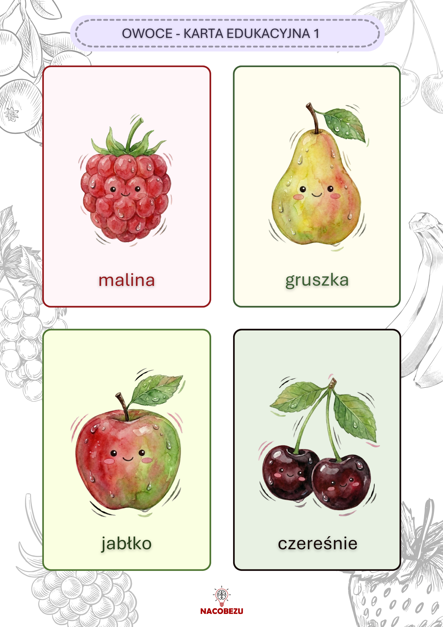 Jeśli chcesz połączyć temat owoców z warzywami (np. przy okazji rozmów o zdrowym jedzeniu i planowania posiłków), zajrzyj też do kart „Warzywa”: https://nacobezu.pl/karty-edukacyjne-warzywa/ — świetnie uzupełnią zajęcia i zabawy językowe.