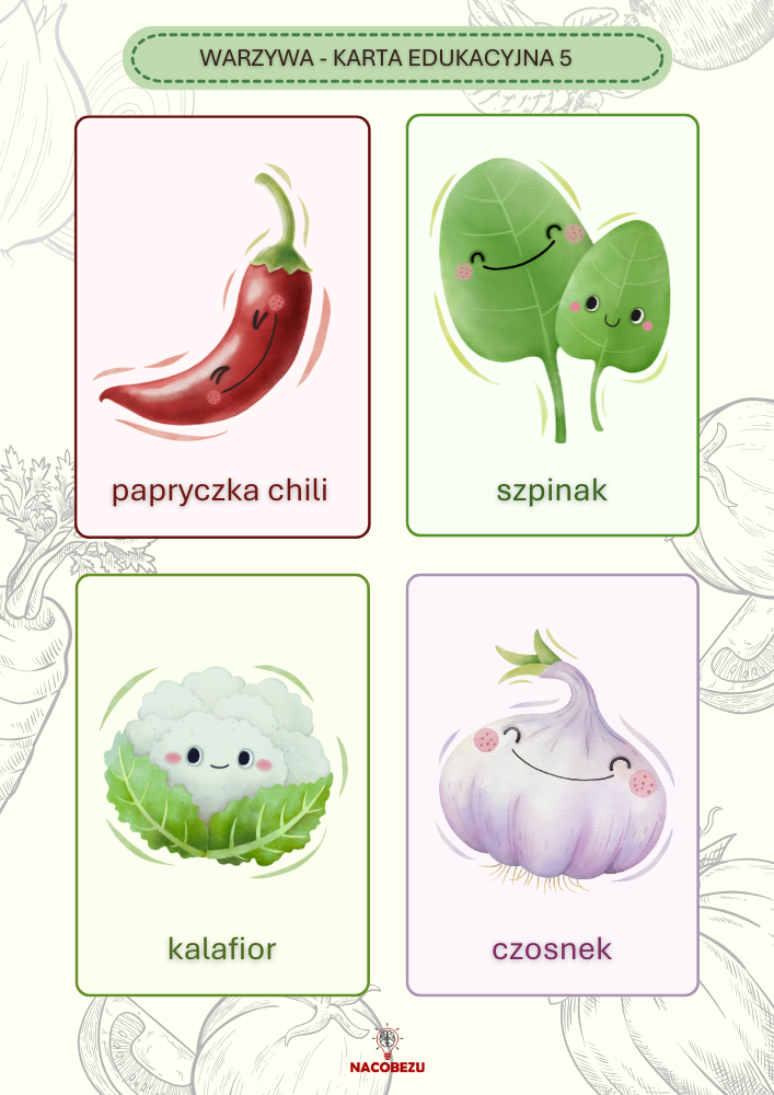 Jeśli planujesz zajęcia o warzywach w wersji wiosennej, zajrzyj też do „Nowalijek do druku”: https://nacobezu.pl/nowalijki-do-druku/ — znajdziesz tam karty do wycinania oraz gotowy pomysł na zabawę w małego MasterChefa.