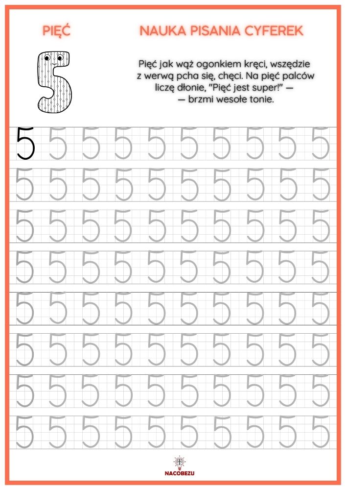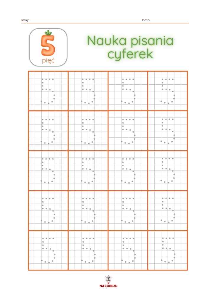 PAMIĘTAJ, ŻE… umiejętność pisania cyfr rozwija się stopniowo i wymaga regularnego treningu w krótkich, przyjemnych sesjach, najlepiej przez zabawę i powtarzanie właściwego kierunku kreślenia. Wczesne, łagodne wprowadzanie cyfr przynosi wymierne korzyści w dalszej nauce matematyki – dziecko szybciej łączy zapis z ilością, sprawniej liczy w pamięci i pewniej podejmuje działania na liczbach jednocyfrowych.