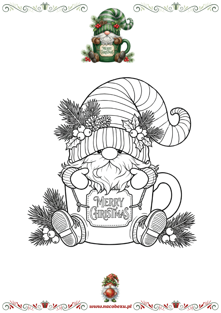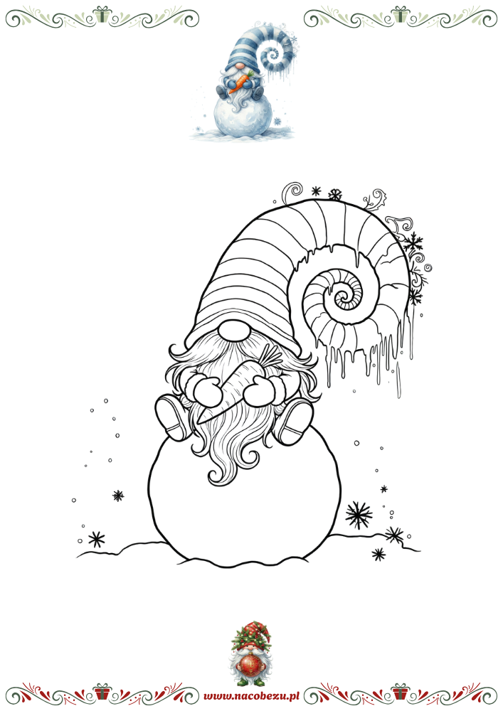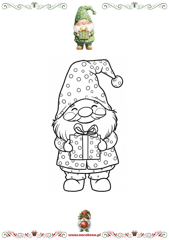 Nasze zimowe gnomy – kolorowanki do druku – to idealna propozycja na długie, chłodne wieczory. Wśród ilustracji znajdziesz urocze skrzaty z bombkami, prezentami, na sankach i pod parasolem, które od razu wprowadzają świąteczny nastrój i zachęcają do twórczej zabawy.